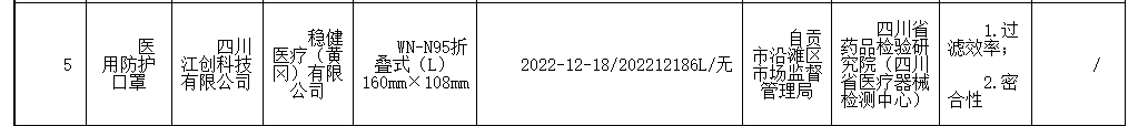 标明医疗器械注册人、存案人为稳健医疗(黄冈)有限公司的医用防护口罩(标准/类型:WN-N95折叠式(L)160mm×108mm;出产日期/批号/出厂编号:2022-12-18/202212186L/无)不合格项目为1.过滤功率;2.密合性。被抽样单位为四川江创科技有限公司,查验组织为四川省药品查验研究院(四川省医疗器械检测中心)。